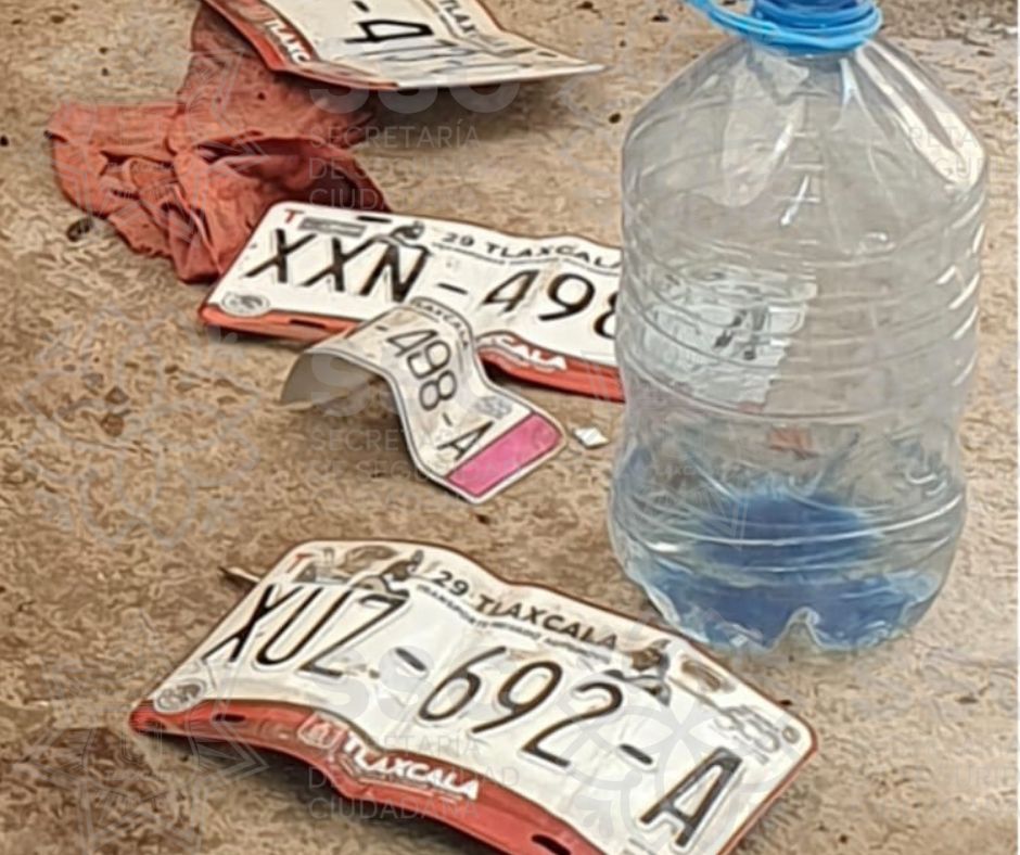 Además, en el lugar se encontraron tres placas de circulación que también cuentan con predenuncia de robo siendo XUZ-692-A particulares del Estado de Tlaxcala, pertenecientes a un Chevrolet, tipo Beat, modelo 2012, con predenuncia del 23 de abril; una placa de circulación XXN-498-A particulares del Estado de Tlaxcala de un Chevrolet, tipo Cavalier, modelo 2019 con fecha del 02 de mayo; y una placa de circulación XTC-473-C particulares del Estado de Tlaxcala de un Chevrolet Aveo, modelo 2018 con predenuncia del 05 de mayo.