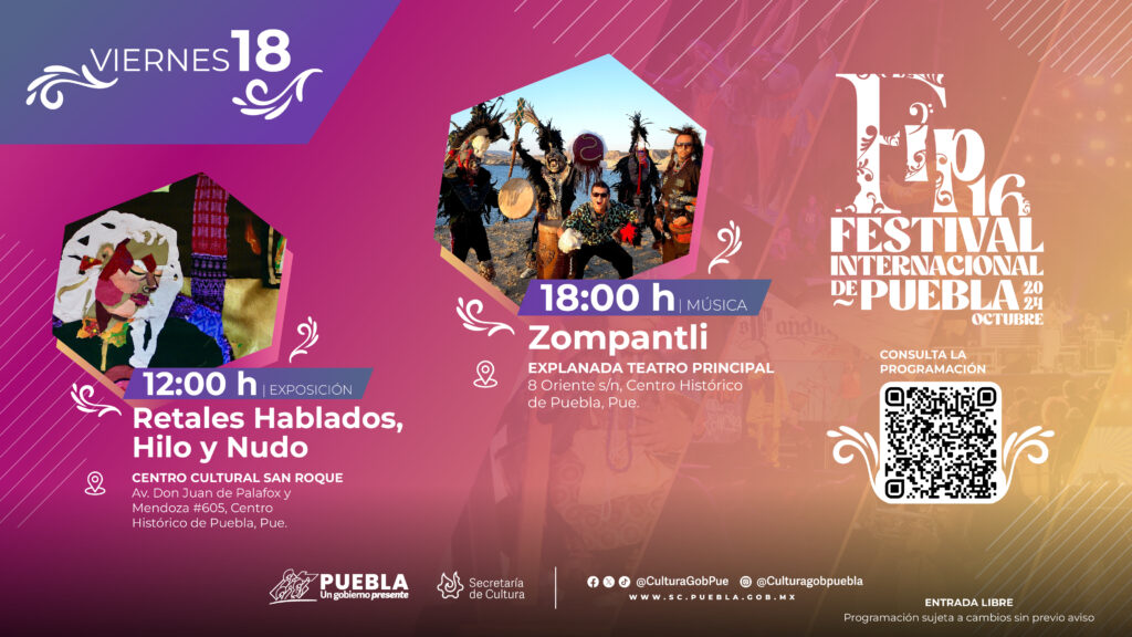 Durante ese mismo día, iniciará la exposición “Retales Hablados, Hilo y Nudo”, que podrá visitarse de martes a domingo, de 10:00 a 18:00 horas, en el Centro Cultural “San Roque” (Avenida Juan de Palafox y Mendoza número 605); y será realizada la obra de teatro “The Black Cat”, a las 19:00 horas, en la Casa de la Cultura “Profesor Pedro Ángel Palou Pérez” (5 Oriente número 5).