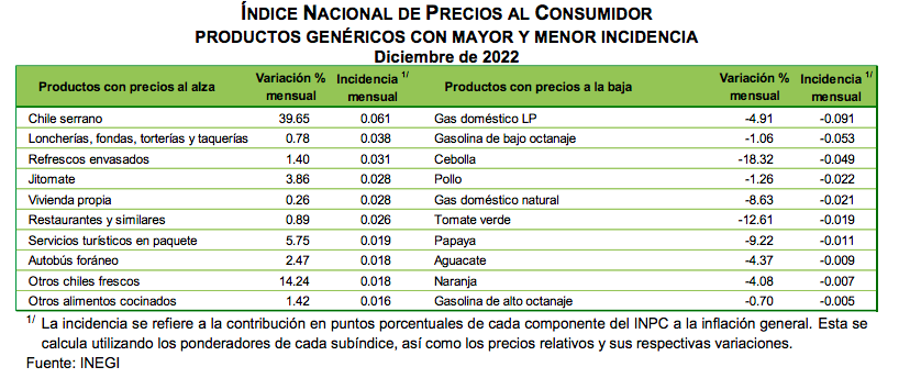 Los productos, bienes y servicios con mayor incremento en precios y que aumentaron la inflación, son: chile serrano con un aumento de 39.6%, seguido de otros chiles frescos 14.24%; servicios turísticos con 5.75% de aumento. El jitomate tuvo un aumento de 3.86% y autobuses foráneos con alza de 2.47%.
