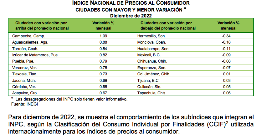 En contraste, las ciudades con menor variación de precios al finalizar el año pasado fueron: Tapachula, Culiacán y Tijuana con 0.06, 0.05 y 0.03 por ciento, respectivamente.