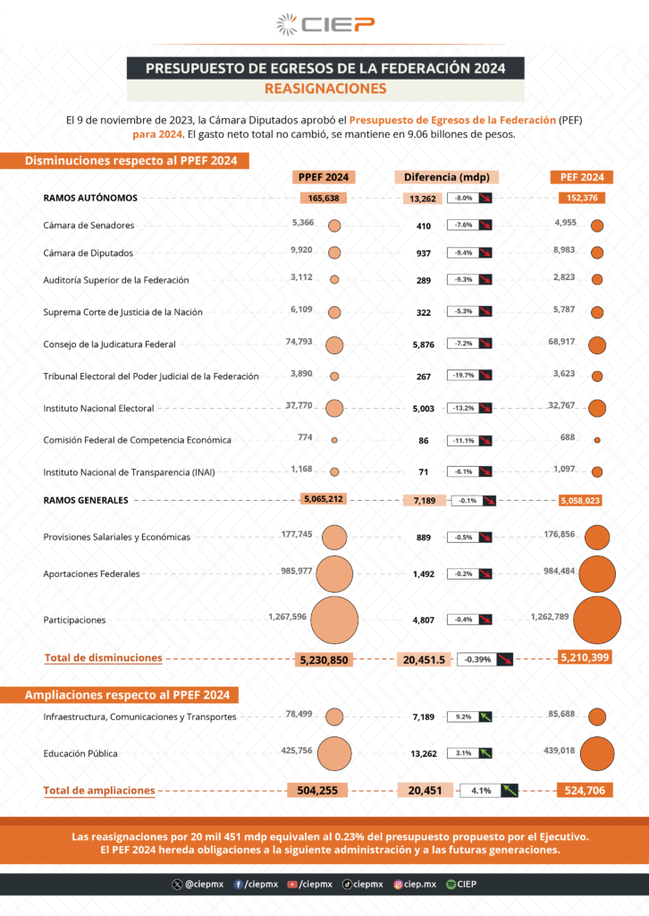 En el documento ‘Presupuesto de Egresos de la Federación 2024. Más deudas para la siguiente administración’, el CIEP refiere que (sin contar los 24 mil 442.9 mdp que pasaron de la Secretaría de Energía a Pemex) las y los diputados aprobaron reasignaciones presupuestales por 20 mil 451.5 mdp. Las disminuciones se observan en los Ramos autónomos, Ramos generales, y entidades, mientras que los incrementos se dirigieron a educación y comunicaciones y transportes.
