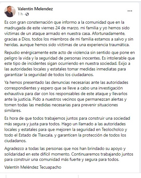 Valentín Meléndez Tecuapacho, es líder de la “Unificación de Concesionarios de Transporte Público de Tlaxcala“, y al momento de la agresión se encontraba al interior de la casa.