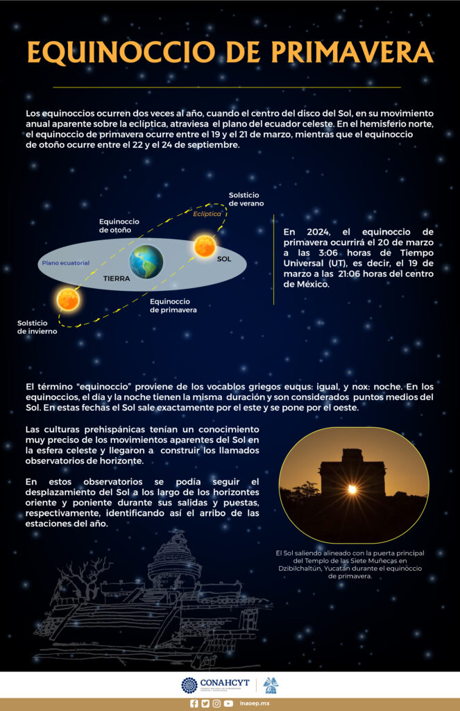 En este 2024, el equinoccio de primavera ocurrirá el 20 de marzo a las 3:06 horas de Tiempo Universal (UT), es decir, este 19 de marzo a las 21:06 horas del centro de México y tendrá una duración de 92 días, 18 horas y 49 minutos.