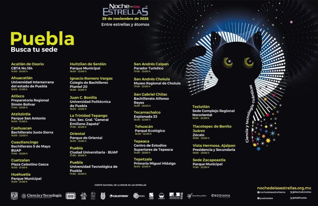 La Noche de las Estrellas es el evento de divulgación científica más importante del país. En la noche del 29 de noviembre, decenas de miles de personas se encontrarán con la ciencia y la cultura y contemplarán el cielo a través de telescopios en más de cien sedes repartidas en todo el territorio nacional. En el estado de Puebla, tendremos 26 sedes repartidas en todo el territorio poblano.