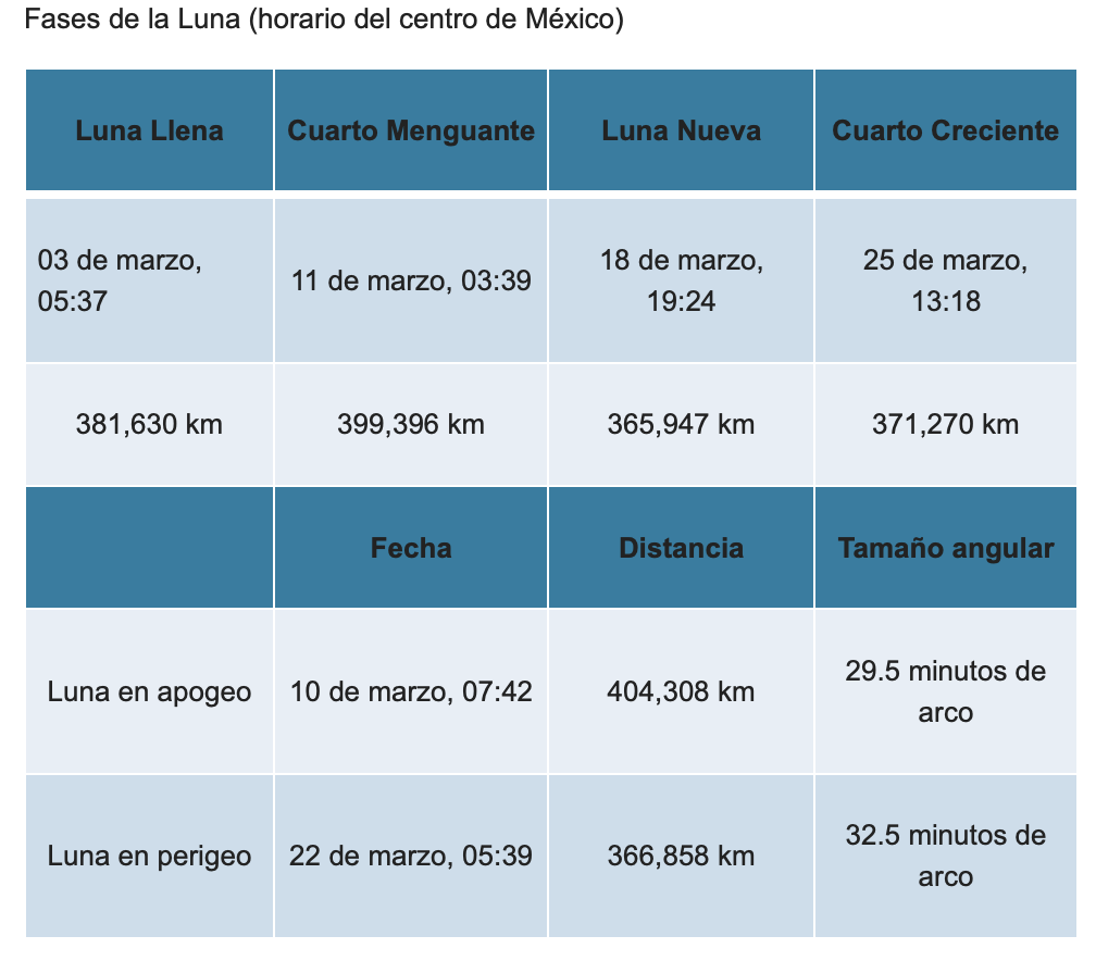 El 3 de marzo tendremos un eclipse total de Luna, entre las 08:45 y las 14:23 UT, esto es, entre las 02:45 y las 08:23 hora del Centro de México. La Luna atravesará la sombra de la Tierra, adquiriendo un tono rojizo. El evento será observable a partir de las 02:45 horas del centro de México y hasta el amanecer, por lo que observaremos la primera parte del eclipse hasta la totalidad, la segunda parte del eclipse dejará de observarse cuando el horizonte y los primeros rayos de Sol lo imposibiliten. El evento será visible en toda la República Mexicana.