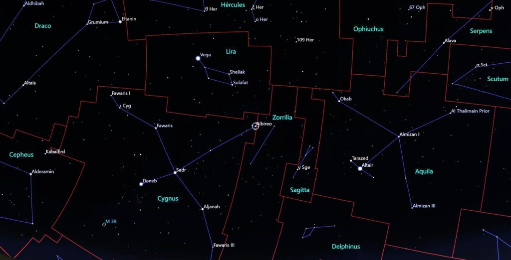 La estrella doble Albireo es la quinta más brillante de la constelación del Cisne y no es de las más impactantes estrellas del firmamento. Sin embargo, esto no resta belleza al sistema compuesto por β1 Cyg (Albireo, que es una estrella doble) y β2 Cyg, que nos brinda una danza de colores naranja y azul, deleitando nuestros sentidos. Albireo se localiza a unos 385 años luz de la Tierra, en tanto β2 Cyg se localiza a 389 años luz de nosotros, ambas en el pico del cisne.  Estarán en buena posición para su observación la mayor parte de las noches de este mes, como ya mencionamos, en dirección de la constelación del Cisne, hacia la parte noreste de la esfera celeste.