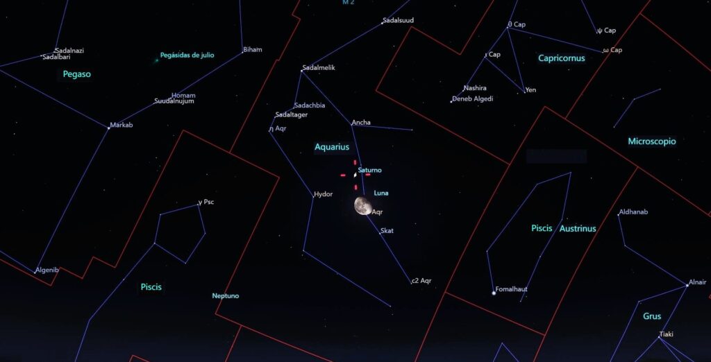 El 7 de julio a las 03:09 (Tiempo Universal) estarán en conjunción la Luna y Saturno. La Luna pasará a 2° 40´ al sur del planeta, ambos en dirección de la constelación de Acuario. La aproximación será visible al filo de las 23 horas del 6 de julio, hacia la parte sureste de la esfera celeste.