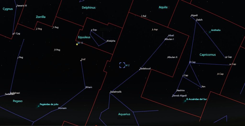 El cúmulo globular M2 tiene una magnitud aparente de 6.6, por lo que es un objeto no visible a simple vista, pero con instrumentos simples como binoculares o pequeños telescopios, puede visualizarse como una pequeña nebulosa. M2 estará bien ubicado para su observación la mayor parte de la noche, hacia el este de la esfera celeste.