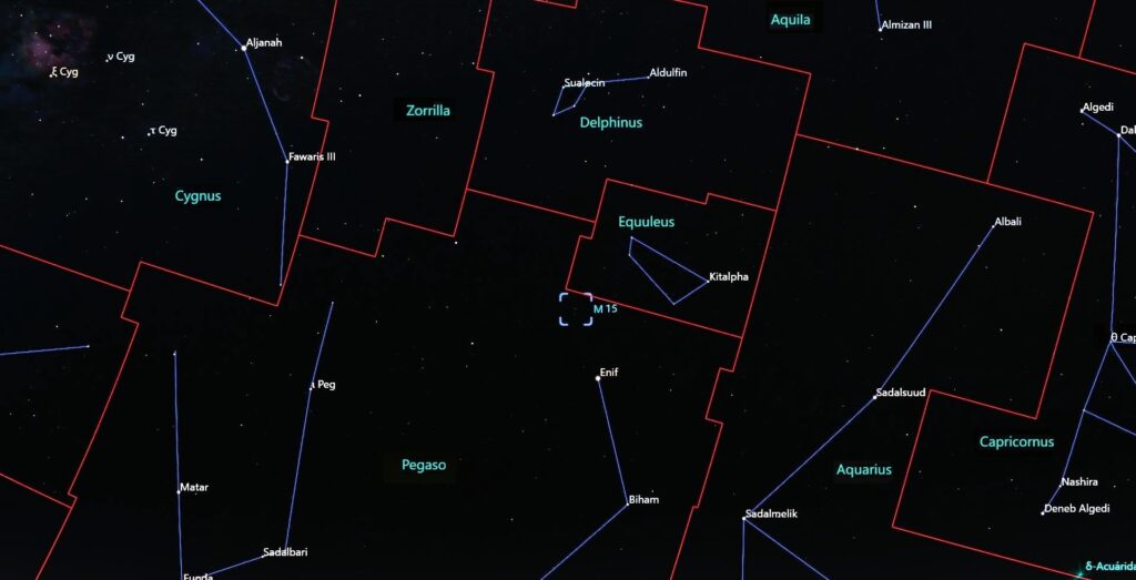 El cúmulo globular M15 es uno de los más densos, se localiza a 33,600 años luz de la Tierra, tiene un diámetro de 18 minutos de arco o unos 175 años luz y está compuesto de estrellas azules y naranjas, con una edad aproximada a 13 mil 200 millones de años; además, es conocido por ser el primer cúmulo globular en el que se detectó una nebulosa planetaria y quizá un agujero negro de masa intermedia, de unas 4,000 masas solares.