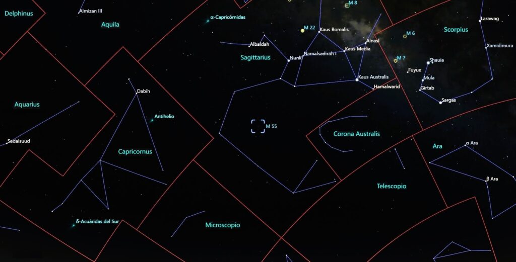 El mejor mes para observar a M55 o NGC 6809 es julio, cerca de la medianoche, cuando alcanza su punto más alto; bastarán unos binoculares o un pequeño telescopio para encontrarlo en dirección de la constelación de Sagitario, hacia el sureste de la esfera celeste.