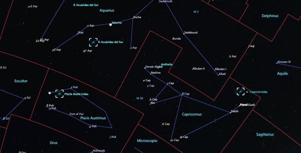 v La lluvia de meteoros Piscis Austrínidas tendrá actividad del 15 de julio al 10 de agosto, con su máximo el 29 de julio. La tasa máxima observable será de 5 meteoros por hora, en dirección de la constelación del Pez Austral. Se desconoce el objeto precursor de la lluvia, pero el mejor momento para observarlas será al amanecer del día 29, hacia la parte sureste de la esfera celeste.