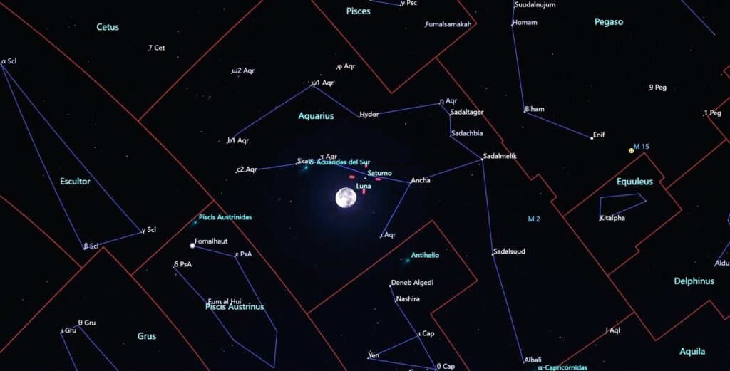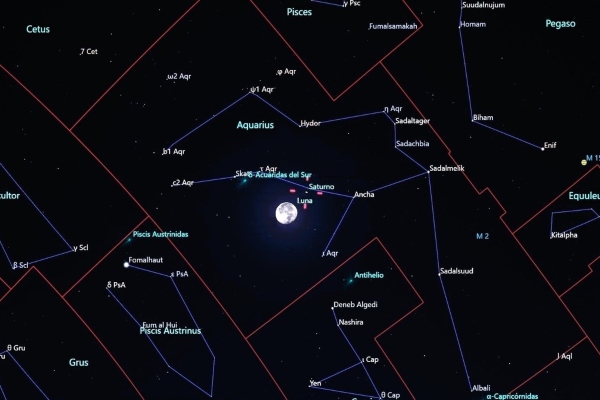 Durante todo el mes, Saturno será un protagonista, junto con la Luna. El día 3 a las 4:25 horas, tiempo del centro de México, habrá una conjunción de la Luna con Saturno, de tal manera que la Luna pasará a solo 2° 28´ al sur de Saturno, en dirección de la constelación de Acuario, hacia el sureste de la esfera celeste. El propio Saturno “robará cámara” nuevamente el 27 de agosto a las 2:20 horas, tiempo del centro de México, cuando esté en oposición, es decir, cuando el planeta y el Sol se encuentran en lados opuestos del cielo. Casi al mismo tiempo estará en perigeo, a una distancia de 8.76 U.A. al Sol. Todo esto, en dirección de la constelación de Acuario.
