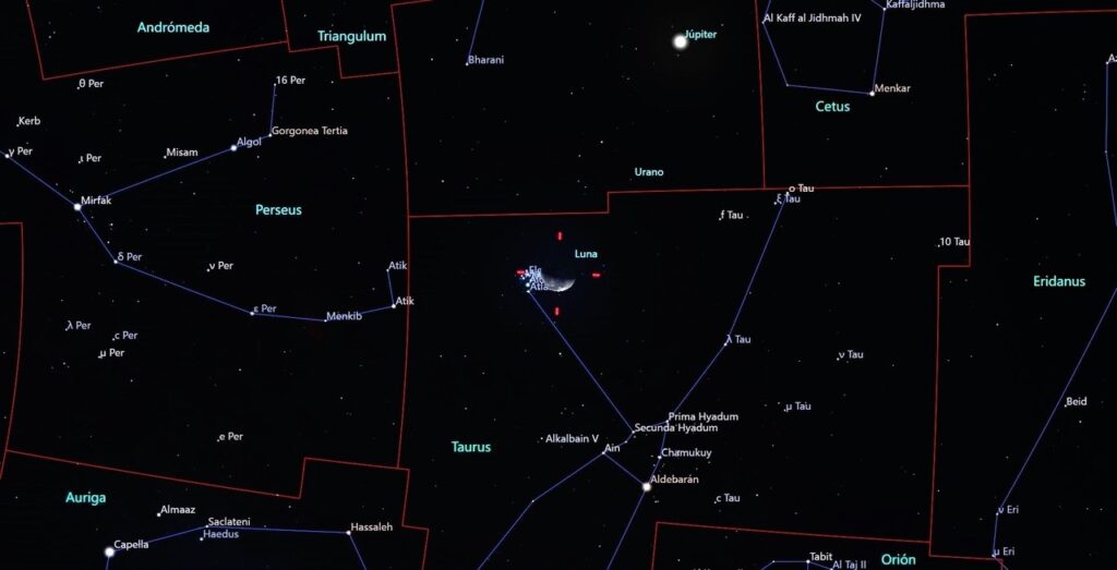 Nuestro satélite natural y viajero hace un gran acercamiento al famoso cúmulo abierto M45 (las Pléyades). La Luna pasará a tan solo 1° 20’ de este cúmulo abierto. La mitología griega cuenta que las Pléyades eran siete hermanas (Alcyone, Electra, Maia, Merope, Taigeta, Celaeno y Asterope), hijas del Titán Atlas y la ninfa marina Pleione, y son visibles a simple vista. La aproximación se podrá observar en dirección de la constelación de Tauro. La aproximación será observable durante la madrugada del día 9, aunque la máxima cercanía se alcanzará cerca de la salida del Sol.