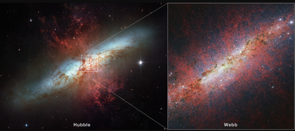 “M82 ha obtenido una variedad de observaciones a lo largo de los años porque puede considerarse como el objeto ejemplar de galaxias con intensa actividad de formación estelar”, dijo Bolatto en una nota de prensa publicada hoy en el portal de NASA (https://go.nasa.gov/4aISO3f). “Tanto el telescopio espacial Spitzer como el Hubble de la NASA han observado este objeto, pero ninguno de estos telescopios podía ver subestructura tan detallada de las plumas como el James Webb.