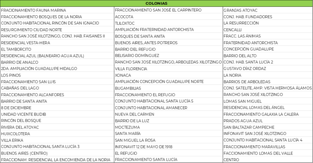 Las colonias que tendrán desfase en sus días de suministro de agua son las siguientes: