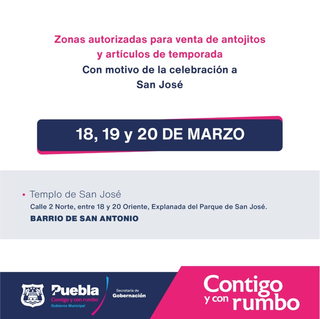 Por motivo de las celebraciones patronales que se realizarán este fin de semana, del 18 al 20 de marzo la Secretaría de Gobernación del Municipio de Puebla permitirá la venta de antojitos y artículos de temporada en inmediaciones del Templo de San José.