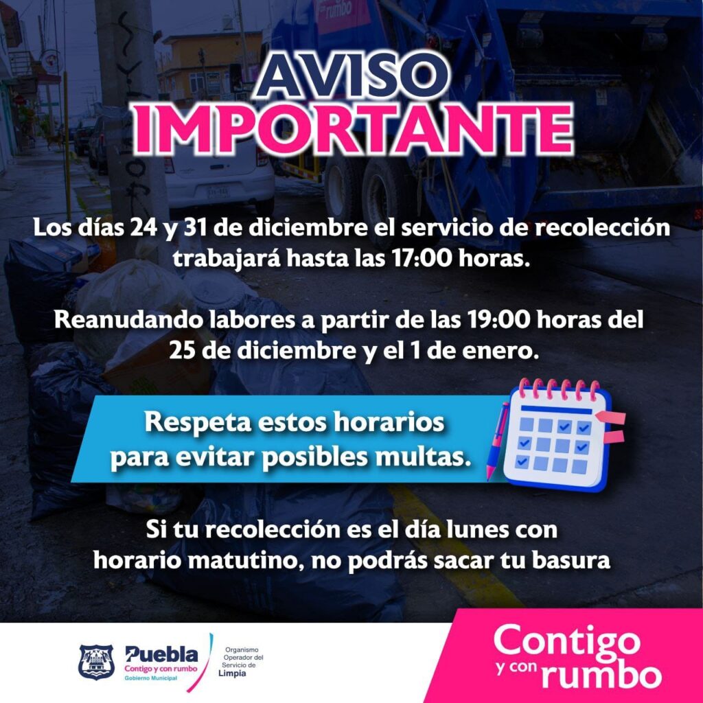 Con motivo de las celebraciones de Navidad y Fin de Año, el Ayuntamiento de Puebla informa que el servicio de recolección domiciliaria de basura en el municipio de Puebla, modificará su horario de labores en unidades habitacionales y Centro Histórico, ya que trabajará hasta las 17:00 horas los días 24 y 31 de diciembre de 2023 .