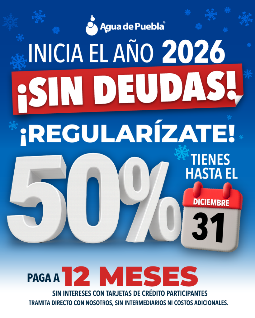 Agua de Puebla informa a sus usuarios que ya no habrá prórroga del programa Regularízate con 50% de ahorro en su adeudo, deban lo que deban, por lo que el 31 de diciembre de este 2025 es la fecha límite para ponerse al corriente en sus adeudos de agua potable, drenaje y saneamiento, con ese beneficio.