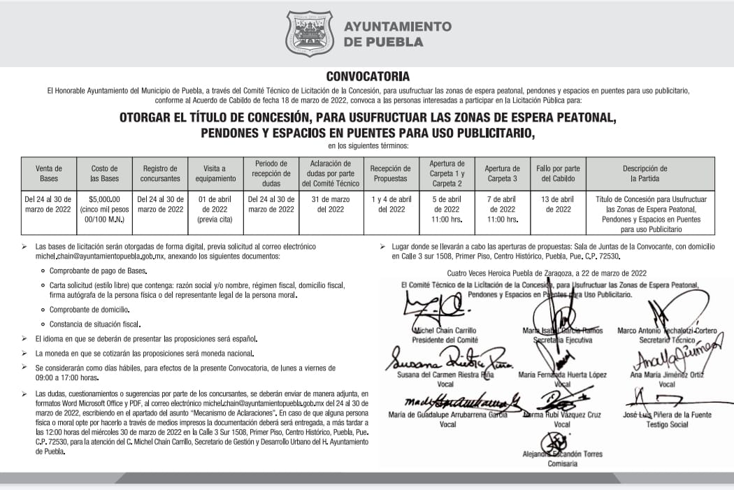 La misma firma podrá comercializar espacios publicitarios en puentes y pendones en 800 puntos de 26 vialidades de la ciudad de Puebla.