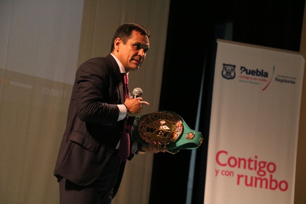 Sumar a nobles causas en beneficio de la sociedad es compromiso del Ayuntamiento de Puebla, por ello la Comisión de Participación Ciudadana en el H. Cabildo capitalino -a cargo del Regidor Alfredo Ramírez Barra- y el Instituto Municipal del Deporte -encabezado por Antonio Iriarte González- presentaron la conferencia ‘A Dios Rogando y con los Guantes Dando’, impartida por el exboxeador Ricardo “El Finito” López.