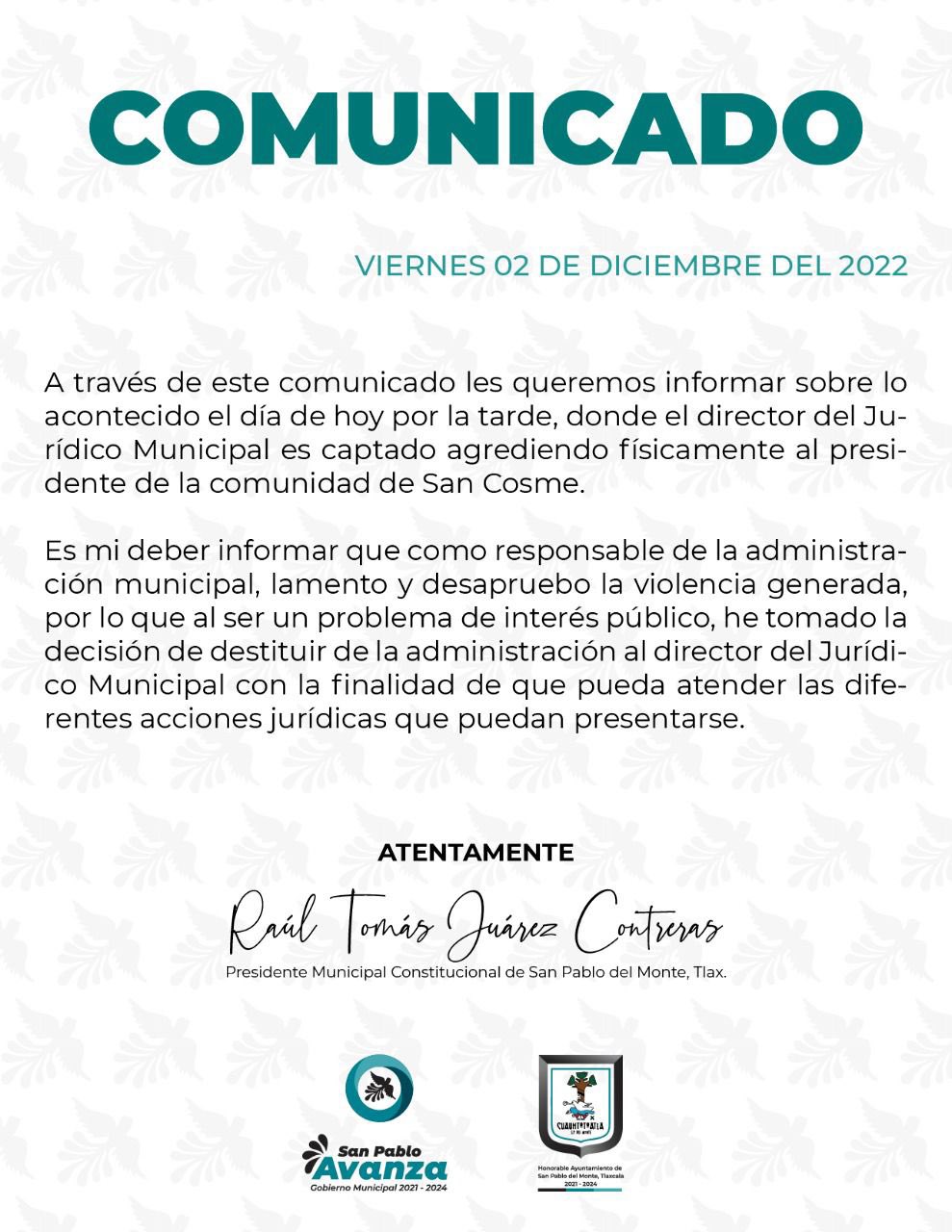 El director jurídico de San Pablo del Monte, Cruz Aaron Juárez. fue destituido de su cargo tras golpear y amenazar al presidente de comunidad de San Cosme Alejandro Martínez quien se presentó al domicilio del funcionario municipal para cortar el servicio de agua tras detectarse una toma clandestina y adeudos.
