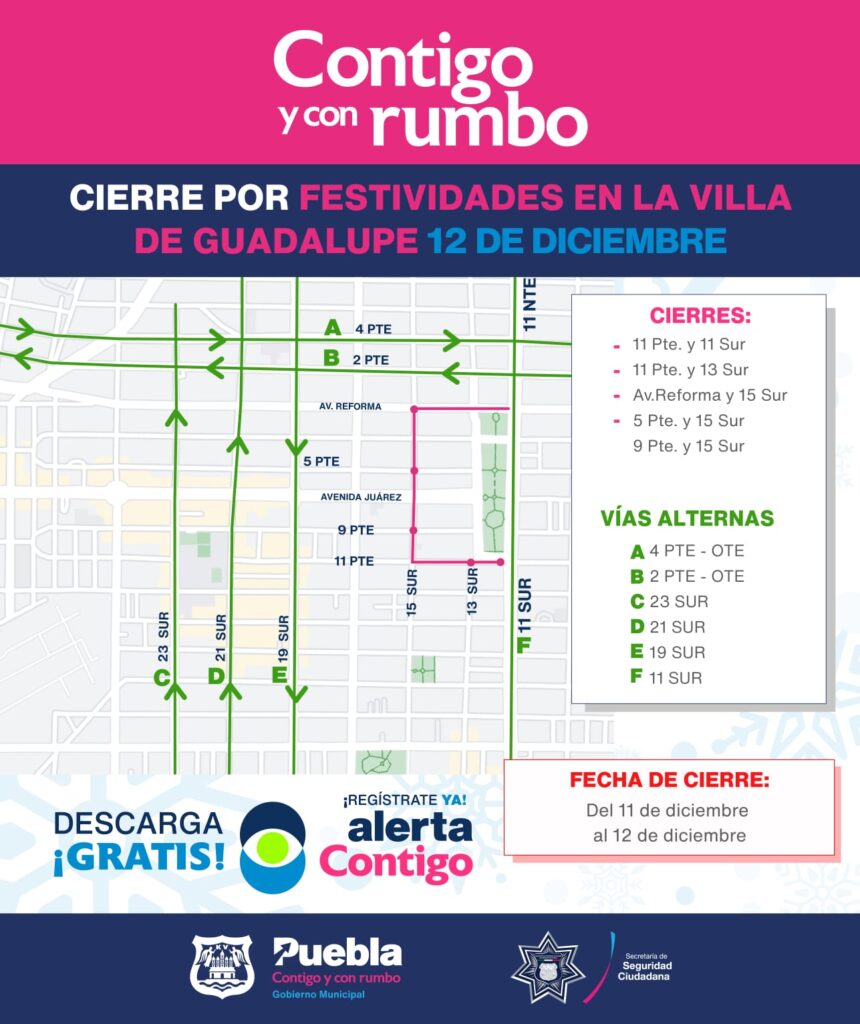 Debido a la celebración de las festividades religiosas en la Villa, a lo largo de este 11 y 12 de diciembre se implementan cierres a la circulación en la zona del Paseo Bravo; intersecciones 11 Poniente y 11 Sur, 11 Poniente y 13 Sur, Reforma y 15 Sur, 5 Poniente y 15 Su, así como 9 Poniente y 15 Sur permanecerán sin paso vehicular.