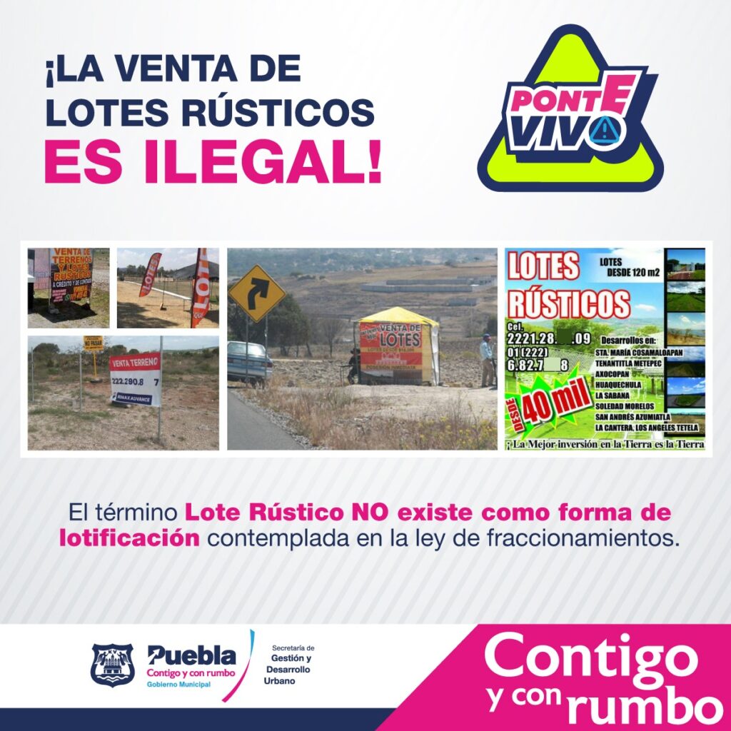 Asimismo, se recuerda a la población que la venta de “Lotes Rústicos” es ilegal; el término no existe como una forma de lotificación contemplada en la Ley de Fraccionamientos, por lo que la publicidad que ofrece este tipo de terreno debe considerarse como un tipo de fraude.