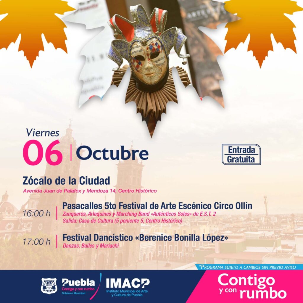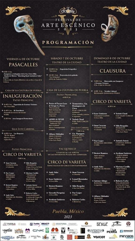 Todo comienza este 6 de octubre con el arranque del V Festival de Arte Escénico 2023 Circo Ollín; las pasacalles y verbena que saldrá del Zócalo de la Ciudad a las 16:00 horas y culminará en Casa de Cultura para que a las 17:30 se viva el festejo inaugural que contempla música, clown, malabares y más.