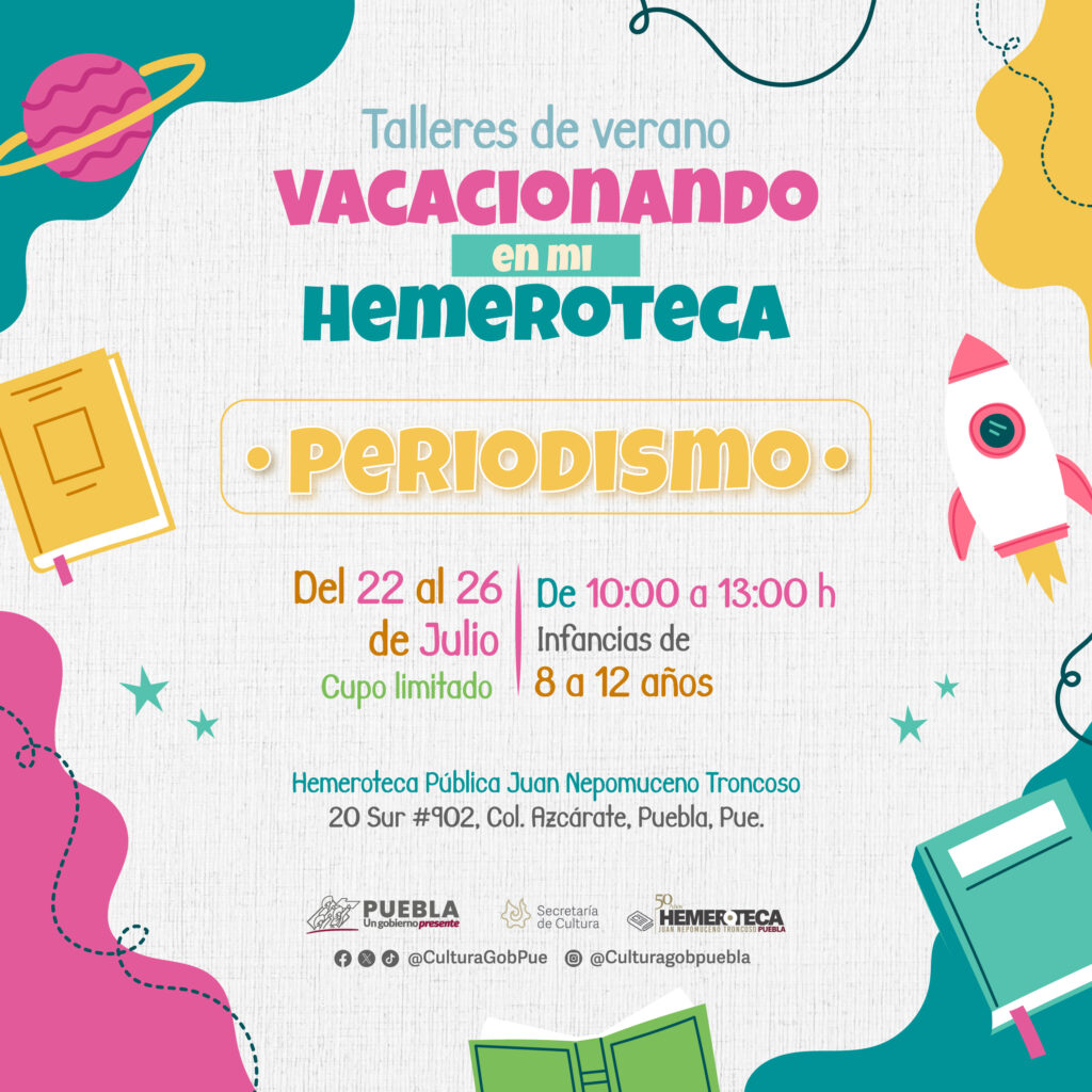 Para conmemorar el 50 aniversario de la Hemeroteca Pública del Estado “Juan Nepomuceno Troncoso”, el gobierno presente de Sergio Salomón, a través de la Secretaría de Cultura, ofrecerá en dicho recinto los talleres “Vacacionando en mi Hemeroteca”, dirigidos a niñas y niños de entre 8 y 12 años.