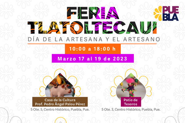 Para conmemorar el Día del Artesano (19 de marzo) y reconocer el trabajo realizado por los mismos, el gobierno de Puebla, a través de la Secretaría de Cultura, desarrollará la Feria Artesanal “Tlatoltecaui” del 17 al 19 de marzo en tres recintos del Centro Histórico.