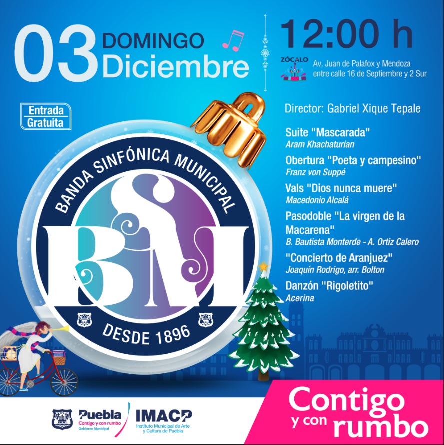 IMACP invita a los domingos de arte y cultura para todos este 03 de diciembre a las 12:00 horas en el Zócalo con presentación de la Banda Sinfónica Municipal un evento que vale la pena escuchar, a las 15:00 horas ‘El Festival Navideño de Rondallas Puebla 2023’ se presenta en el Zócalo con una exposición de música que pondrá a cantar a más de uno.