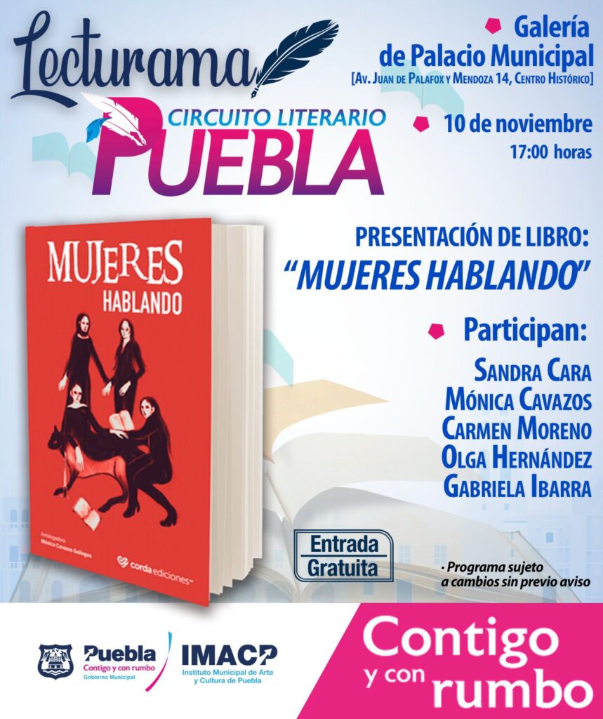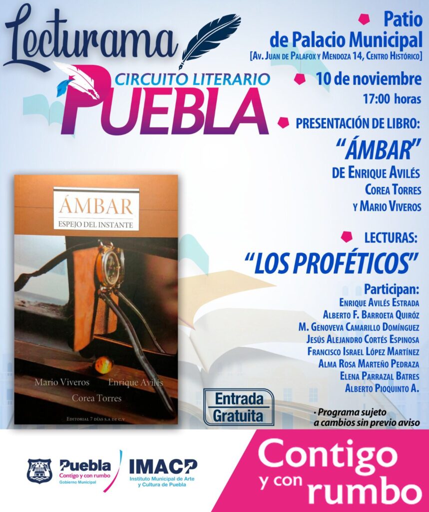 Todo comienza este viernes a las 17:00 horas con ‘Lecturama’ en el Patio de Palacio Municipal; presentación del libro “Ámbar” de Enrique Avilés y las lecturas poéticas de “Los Proféticos”. Simultáneamente, en la Galería de Arte Palacio Municipal, se realizarán la presentación de otro ejemplar literario: “Mujeres hablando”, seguido del anuncio de “Laberintos. Entrevistas” de Óscar Alarcón a las 19:00 horas.