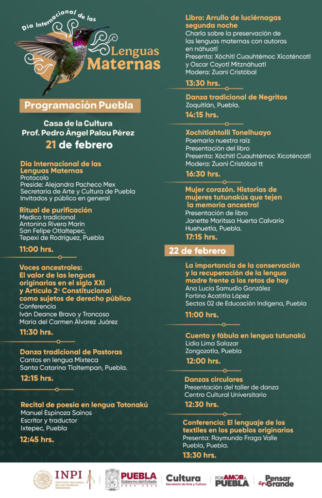 Con una programación gratuita, el gobierno estatal, por medio de la Secretaría de Arte y Cultura, conmemorará el Día Internacional de las Lenguas Maternas (21 de febrero) en la Casa de la Cultura “Profesor Pedro Ángel Palou Pérez”, ubicada en la Calle 5 Oriente número 5, Centro Histórico.