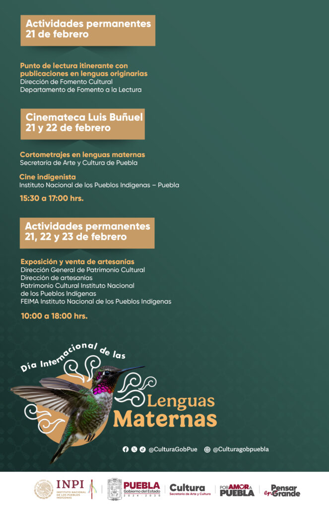 En ambos días, la Cinemateca “Luis Buñuel” albergará proyecciones de cortometrajes en lenguas maternas y el Ciclo Cine Indigenista de 15:30 a 17:00 horas. Además, el patio central será sede de una expoventa artesanal con productos de diversas regiones poblanas, que prevalecerá los días 21, 22 y 23, de 10:00 a 18:00 horas. La programación completa está disponible en la página web sc.puebla.gob.mx.