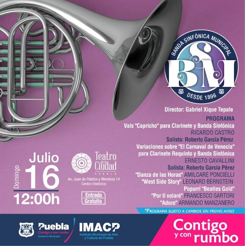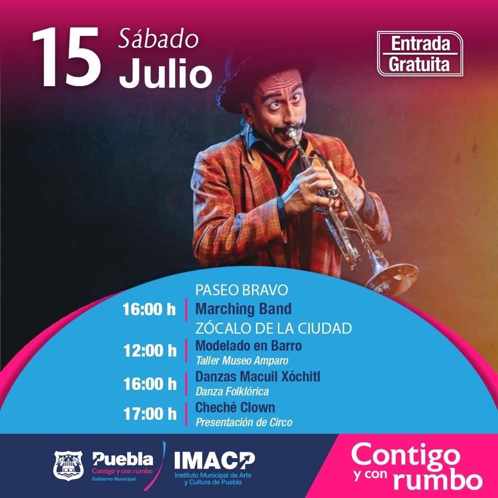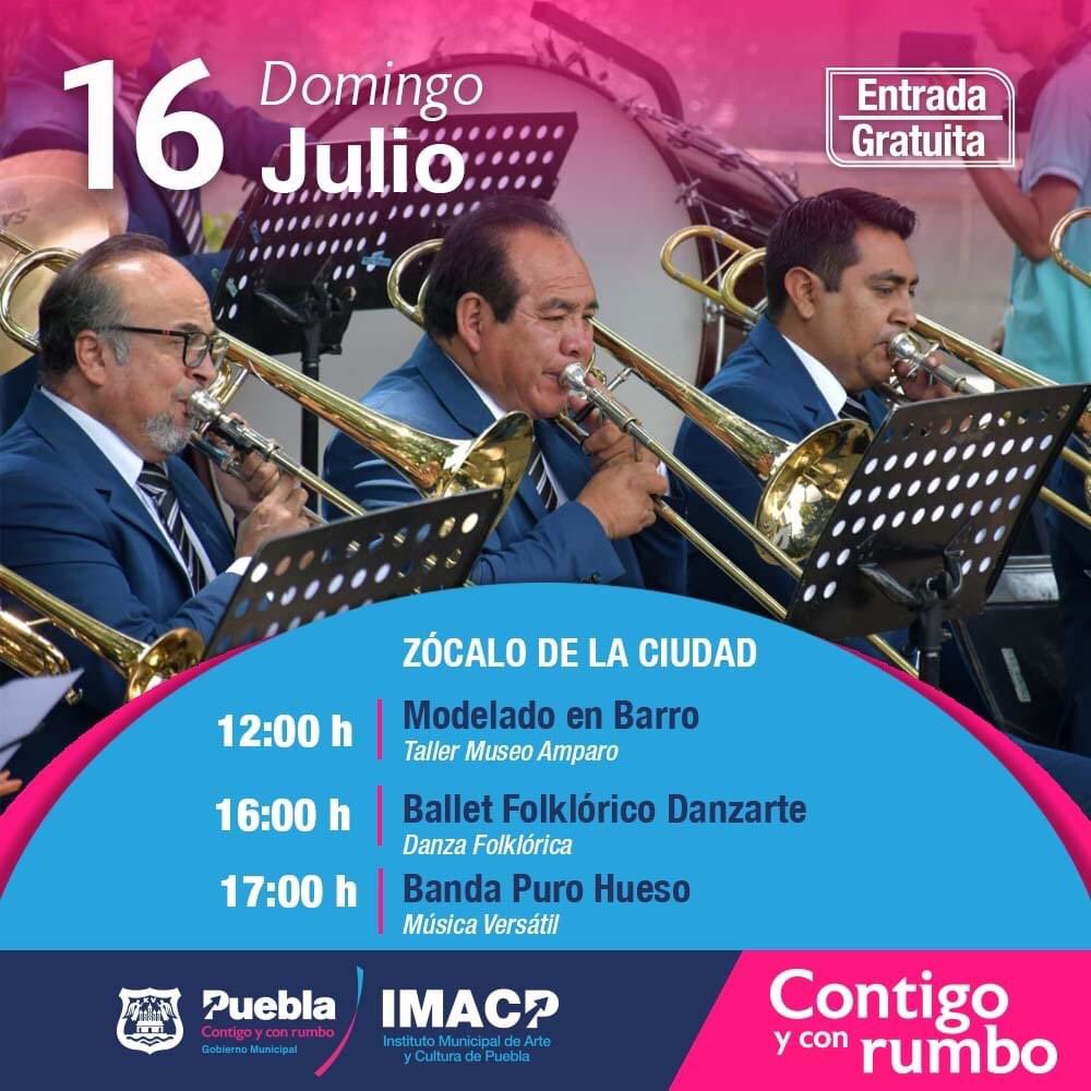 Y para el domingo 16 de julio, el arte y la cultura estarán presentes desde las 12:00 horas con el taller de ‘Modelado en Barro’ que imparte el Museo Amparo en el Zócalo, mientras que en el Teatro de la Ciudad, se presentará la Banda Sinfónica Municipal ofreciéndo a todo público un amplio repertorio con instrumentos diversos de viento y percusión.