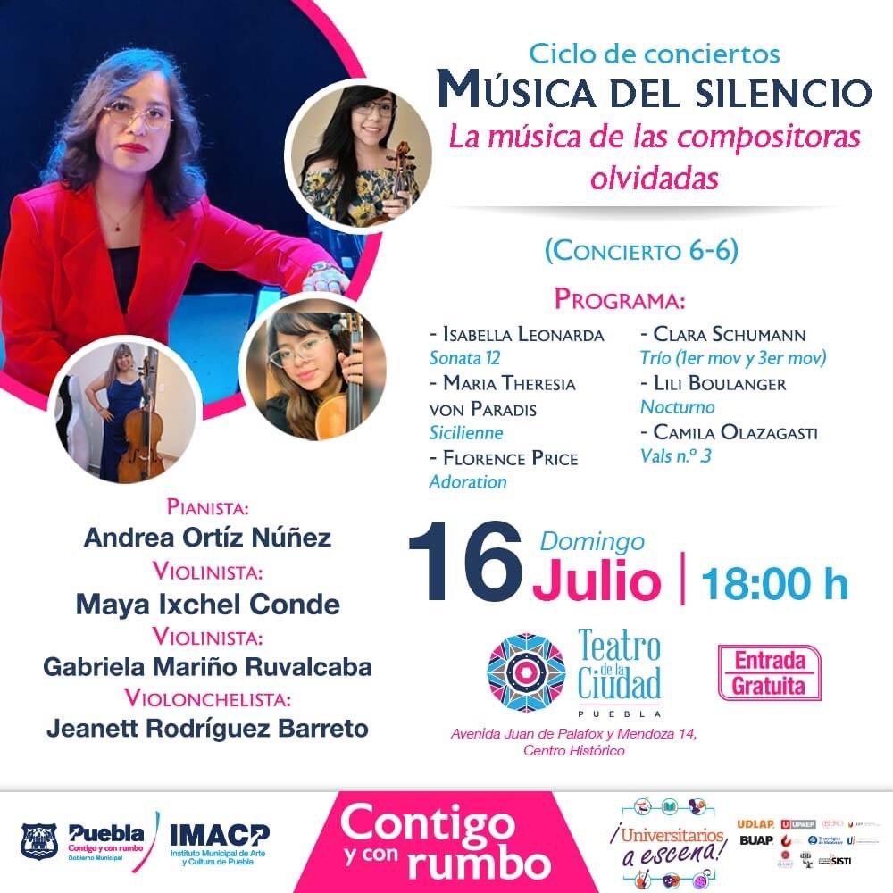 En cuanto al resto de la tarde, a las 17:00 horas se presentará en el Zócalo un grupo de música versátil llamado ‘Banda Puro Hueso‘. Y para cerrar este fin de semana, a las 18:00 horas en el Teatro de la Ciudad, las notas del piano darán voz al Ciclo de Conciertos “Música del Silencio: La música de las compositoras olvidadas” por Andrea Núñez.