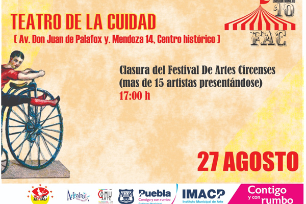 El décimo Festival de Artes Circense estará viviendo su último día el domingo 27, de 11:00 a 16:30 horas en el Zócalo de Puebla con diversas presentaciones para disfrutar, y su clausura será a las 17:00 horas en el Teatro de la Ciudad.