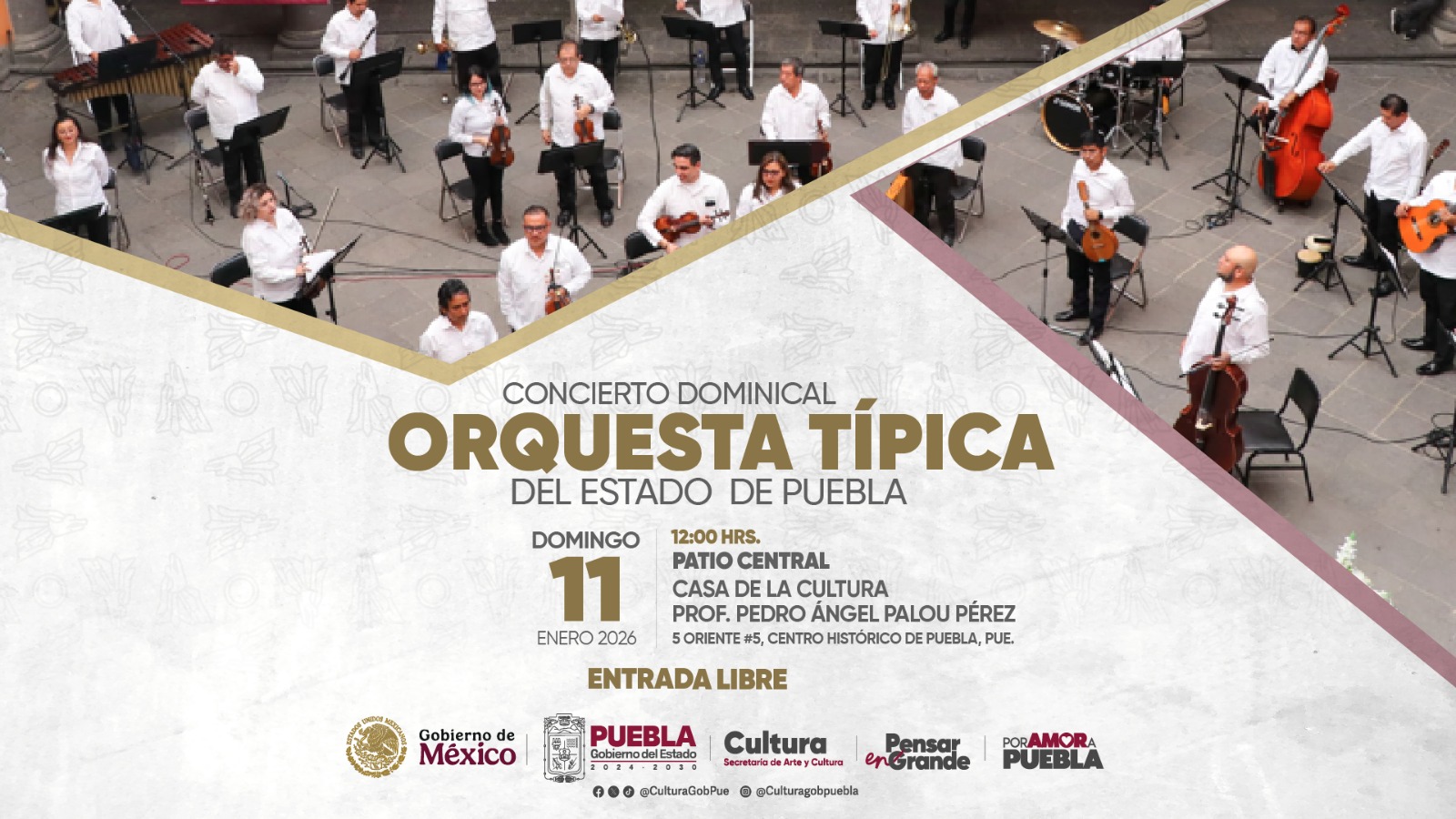 Para el 11 de enero, la programación continúa en la Casa de la Cultura con el concierto de la Orquesta Típica, a las 12:00 horas, una propuesta que celebra la música tradicional, el ritmo y la elegancia, como parte del legado que une a las y los poblanos.