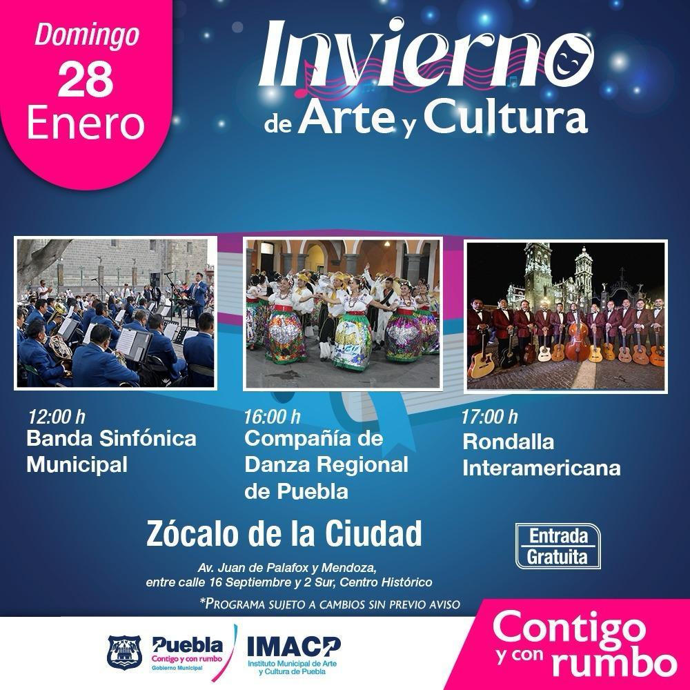En tanto, el domingo 28 habrá música en el Zócalo de la ciudad con la Banda Sinfónica Municipal a las 12:00 horas, La Danza Regional de Puebla a las 16:00 horas y una hora después la Rondalla Interamericana. Mientras que en el Teatro de la Ciudad se presentan alumnos de la Facultad de Artes de la Benemérita Universidad Autónoma de Puebla (BUAP) a partir de las 17:00 horas con la Gala de Ópera.