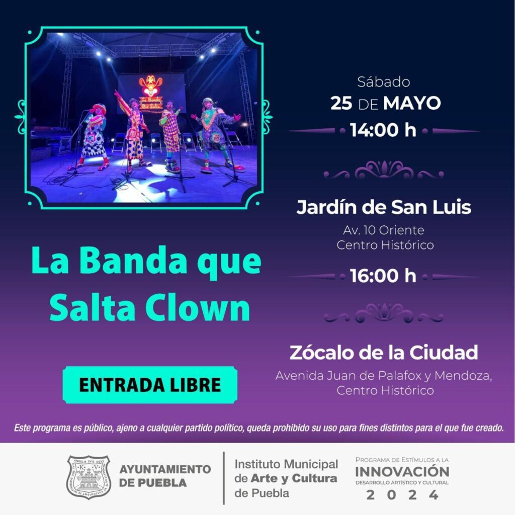 El sábado 25 de mayo, en el Jardín de San Luis, habrá espectáculo de payasos profesionales a las 14:00 y 16:00 horas, además, habrá concierto de pop que dará inicio a las 17:00 horas.