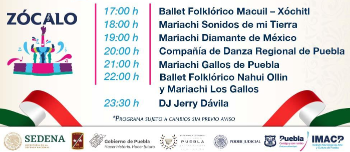Por ejemplo, para el 15 de septiembre, la plaza de armas en punto de las 17 horas iniciará con el Ballet Folklórico “Macuil – Xóchitl”, a las 18 horas llega el Mariachi “Sonidos de Mi Tierra”, una hora más tarde el Mariachi “Diamante México”, las siguientes horas serán de la Compañía de Danza Regional de Puebla, del Mariachi “Gallos de Puebla”, del Ballet Folklórico “Nahui Ollin” para cerrar a las 23:30 horas con el famoso DJ Jerry Dávila.