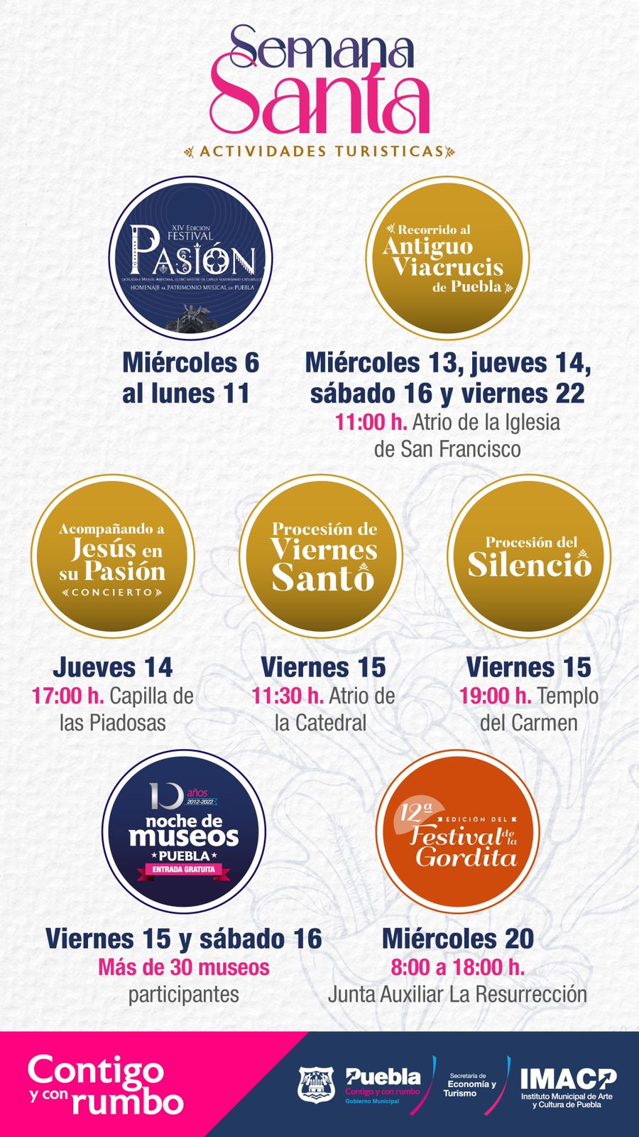 En cuanto a las celebraciones religiosas, además de las procesiones de Viernes Santo y del Silencio, Fabián Valdivia Pérez, precisó que desde el miércoles 13 de abril habrá recorridos con motivo de las representaciones tradicionales de la “Pasión y Muerte de Cristo”, pues ese día iniciará “El Antiguo Viacrucis de Puebla”; una iniciativa para visitar 12 capillas y algunas obras de arte vinculadas a la historia de esta tradición.