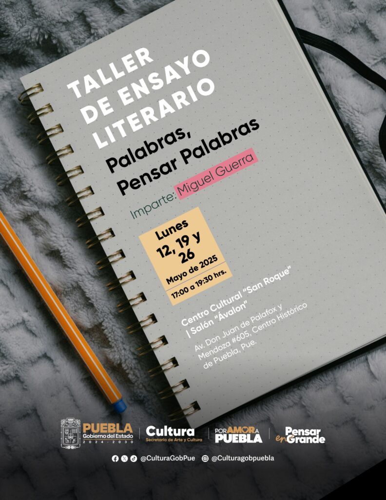 Los días lunes 12, 19 y 26 de mayo; así como 16, 23 y 30 de junio de 17:00 a 19:30 horas, Miguel Guerra impartirá el taller de ensayo literario “Palabras, Pensar Palabras”, donde las y los participantes desarrollarán una obra a través de textos detonantes y ejercicios prácticos. Lo anterior, en un espacio para pensar con libertad, cuestionar lo cotidiano, articular una mirada crítica y explorar la voz propia.