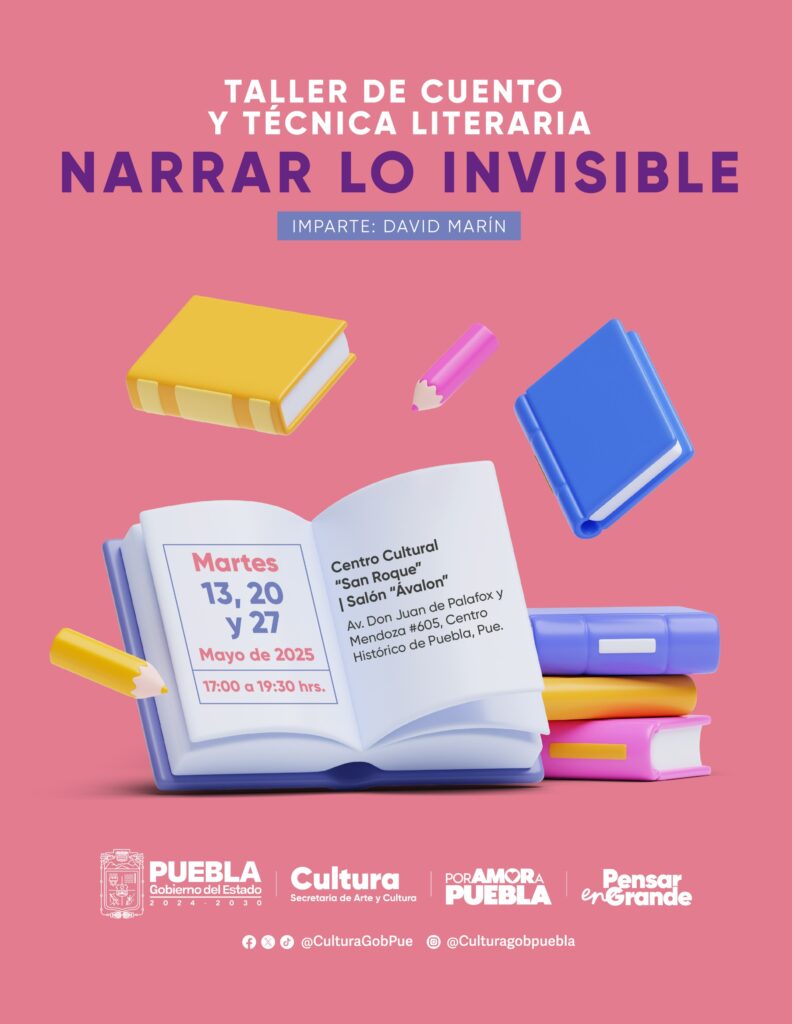 Con el impulso que el gobernador Alejandro Armenta encabeza para las y los creadores artísticos poblanos, la Secretaría de Arte y Cultura ofrecerá en los meses de mayo y junio, cuatro talleres literarios para jóvenes y adultos en el Centro Cultural “San Roque”, ubicado en la avenida Juan de Palafox y Mendoza No. 605 del Centro Histórico.