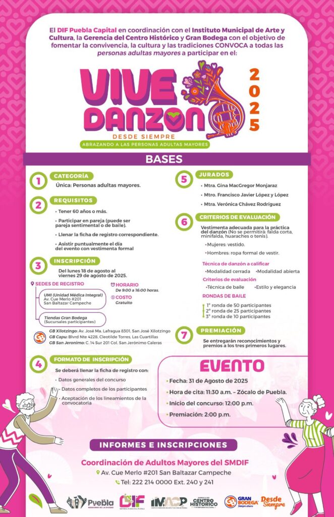 Como parte del compromiso del DIF que tiene la presidenta del Patronato del DIF Puebla Capital, MariElise Budib por apoyar y reconocer la labor de las personas adultas mayores, y en coordinación con el Instituto Municipal de Arte y Cultura (IMACP), la Gerencia del Centro Histórico y Gran Bodega, se llevará a cabo el primer “Vive Danzón: Desde siempre abrazando a las personas adultas mayores”, el próximo domingo 31 de agosto a las 12:00 horas en el Zócalo.