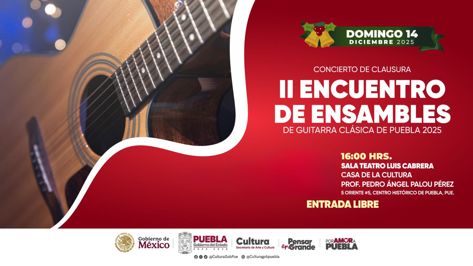 La Secretaría de Arte y Cultura invita al público a disfrutar del II Encuentro de Ensambles de Guitarra Clásica de Puebla, un espacio que exalta la sensibilidad y profundidad de este instrumento universal. El concierto principal reúne a destacadas agrupaciones como el Ensamble Neo Naft, la Orquesta de Guitarras Azomalli, la Orquesta de Guitarras Sol y Luna K’iin Uj, el Ensamble de Guitarras Alfeñique, y a las intérpretes Ameyali Rodríguez y Ximena Trujillo Rodríguez. La cita es el domingo 14 de diciembre a las 16:00 horas, en la Sala Teatro Luis Cabrera.