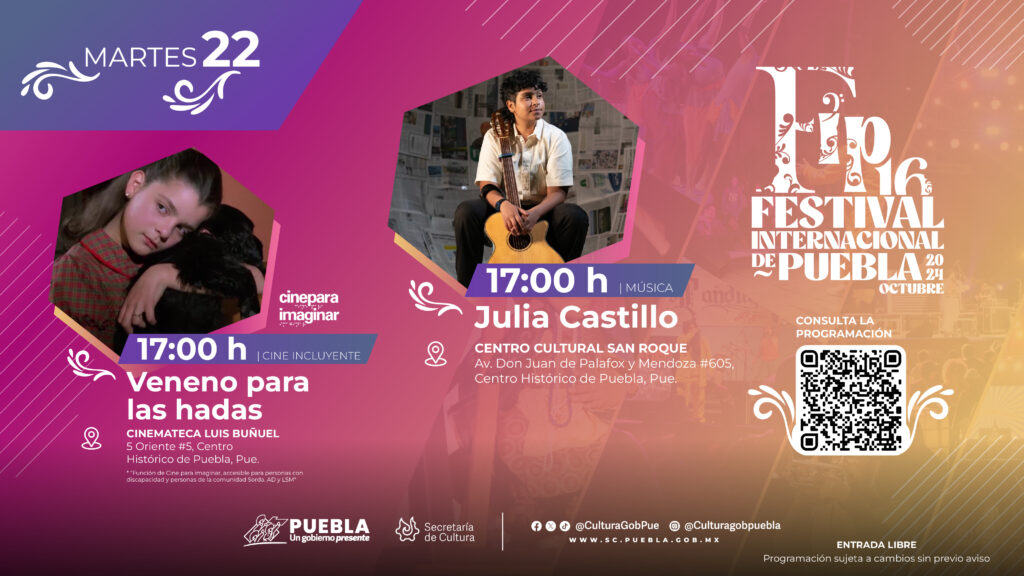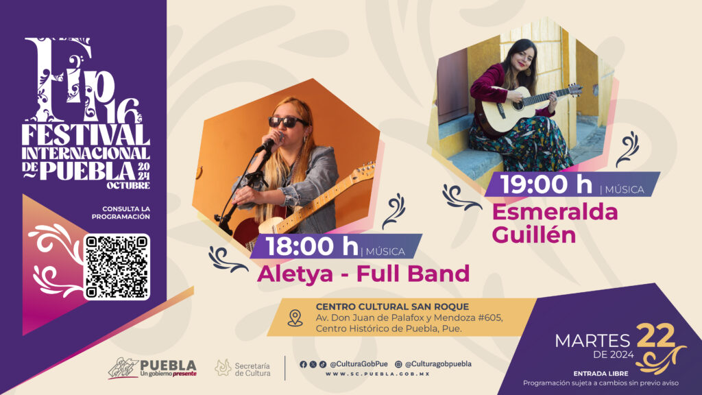Estos conciertos serán con entrada libre y sin boleto al público en general. Para consultar otras actividades de música, teatro, literatura y cine enmarcadas en el FIP 2024, las y los interesados pueden visitar las páginas: Secretaría de Cultura Puebla (Facebook), @culturagobpuebla (Instagram) y @CulturaGobPue (X).