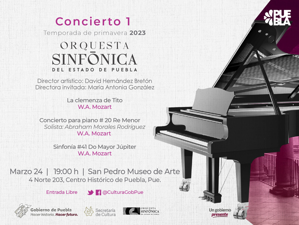 El gobierno de Puebla, a través de la Secretaría de Cultura, alista la temporada de conciertos de primavera de la Orquesta Sinfónica del Estado de Puebla (OSEP), que se llevará a cabo todos los viernes comprendidos entre el 24 de marzo y el 16 de junio en San Pedro Museo de Arte (4 Norte número 203, Centro Histórico).
