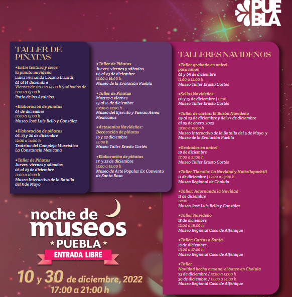 Asimismo, participan los museos: Taller Erasto Cortés, de Arte Popular Exconvento de Santa Rosa, Regional de la Revolución Mexicana “Casa de los Hermanos Serdán”, Interactivo de la Batalla del 5 de Mayo, del Ejército y Fuerza Aérea Mexicanos, Regional de Cholula, Regional Casa de Alfeñique, José Luis Bello y González, de la Evolución Puebla e Internacional del Barroco.