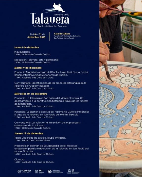 La Secretaría de Cultura de Tlaxcala invita a la ciudadanía y al público en general a participar en la Semana de la Talavera, que se llevará a cabo del 8 al 11 de diciembre en la Casa de Cultura de San Pablo del Monte.